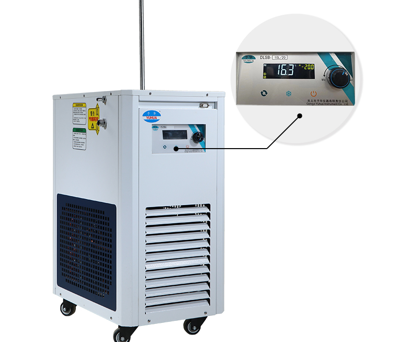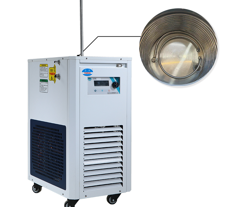 本產(chǎn)品是利用全封閉壓縮機機械制冷,冷卻槽內(nèi)壁盤有冷卻銅盤管,制冷劑(氟利昂)通過水槽內(nèi)壁的盤管不斷循環(huán),對槽內(nèi)冷媒進行冷卻,并通過內(nèi)置循環(huán)泵、外接循環(huán)管路將冷媒輸送到配套設(shè)備夾層或冷凝盤管內(nèi),間接為反應(yīng)器內(nèi)物料進行降溫、對冷凝管接觸蒸汽進行冷卻、液化,該產(chǎn)品一般可連接雙層玻璃反應(yīng)釜,旋轉(zhuǎn)蒸發(fā)器,各種形式的盤管冷凝器使用,也可將玻璃容器放置槽內(nèi)進行內(nèi)置低溫反應(yīng)。